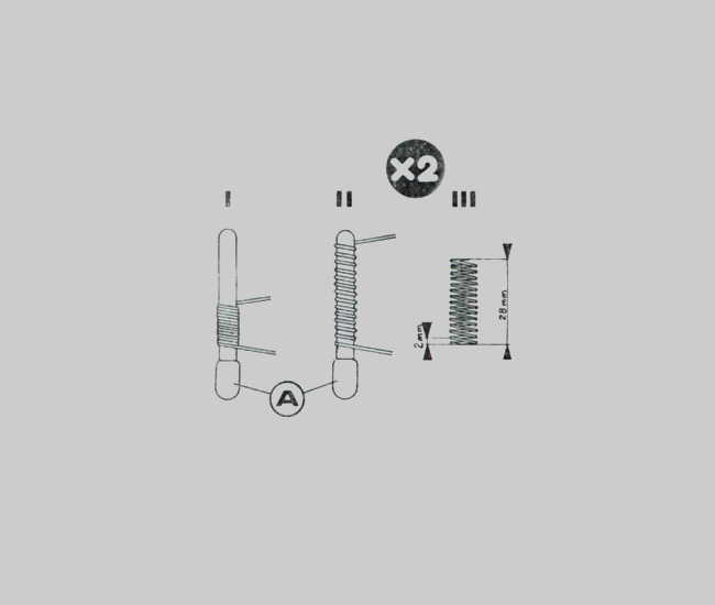 Couper en deux la longueurs égales du fils métalliques. Enrouler un des fils sur axe 185, faires 10 spires, l'étirer à 2 fois sa longueur et le recomprimer de façon à obtenir une longueur totale de 14 mm .