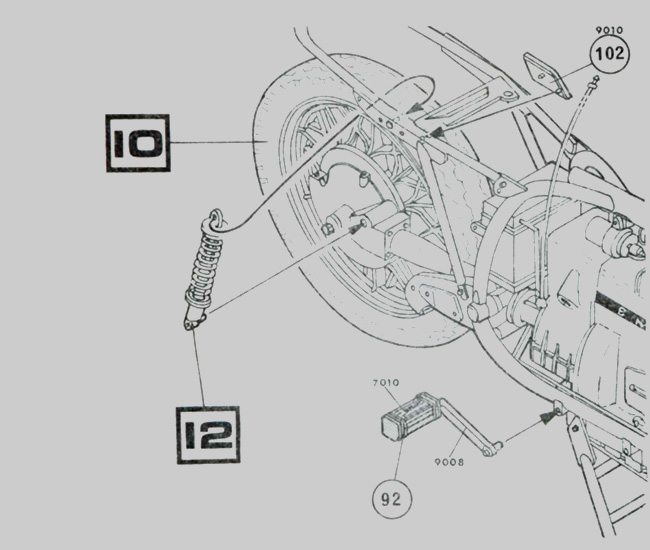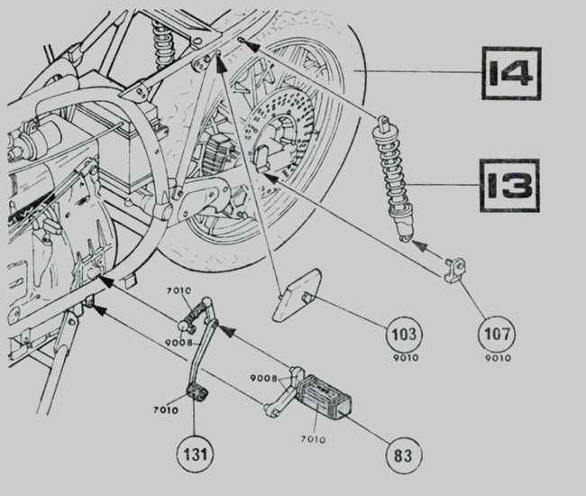 Montage de la suspension arrière gauche sur le cadre, de l’étrier extérieur de suspension, du repose pieds et de la pédale de démarrage (Kick stater).