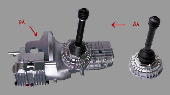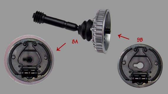 Montage de l'arbre de transmission côté droit avec le tambout de frein sur la partie du bloc moteur.