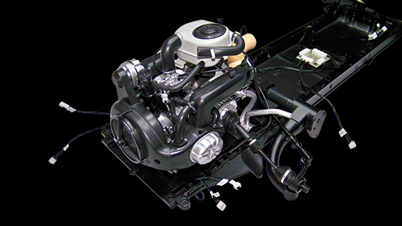 Montage de la suspension avant, direction, transmission et moteur sur le châssis.