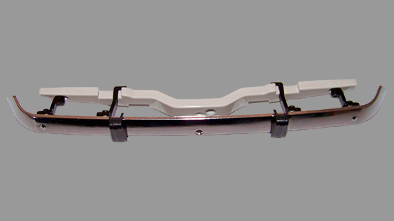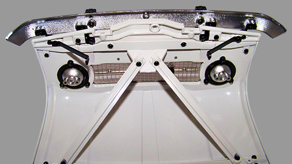 Assemblage de la partie avant, avec les ferrures dur le pare-chocs, les charnières sur le capot et les arbres de transmission.