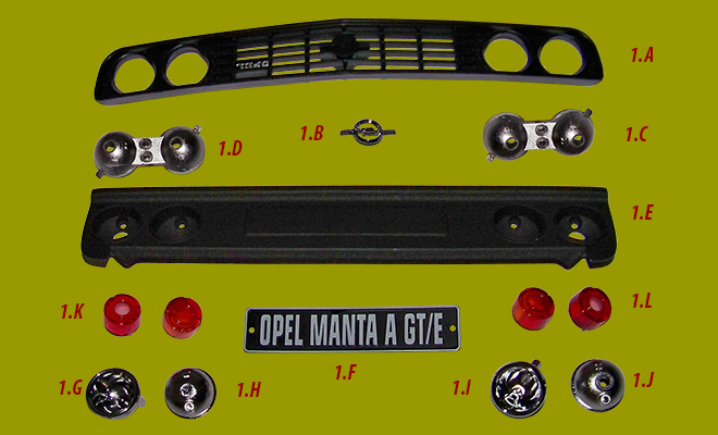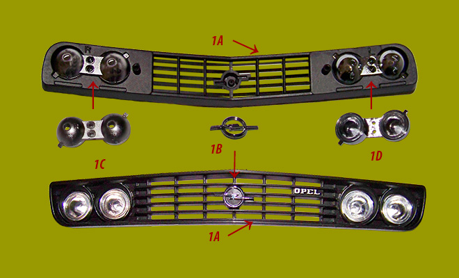Assemblage des phares sur la calandre avant et arrière, du logo Opel, et plaque d’immatriculation .
