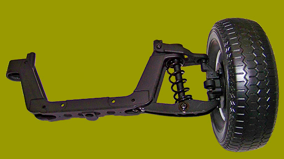 Assemblage des bielles, du porte-fusée, de l’amortisseur, de l’essieu, du disque de frein et montage de la roue sur le train avant droit .