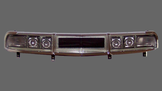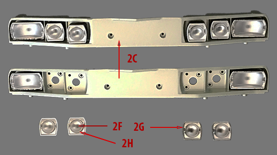 Assemblage des 4 support de phares (2G) sur l’optique des phares (2F) et montage des verres sur les phares (2H) et fixation dans la rampe principale des phares (2C).