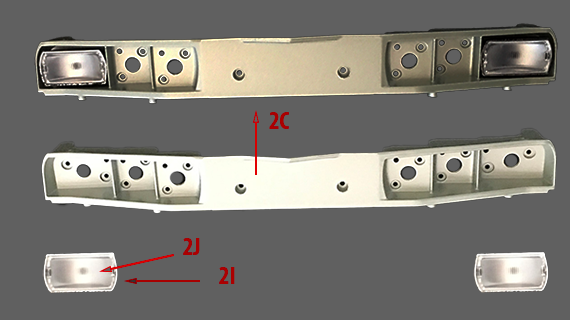 Assemblage des phares principaux (2J – 2I) sur le support du phare principal droit et gauche (2K) et montage dans la rampe principale des phares (2C).