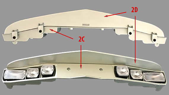 Assemblage de la rampe porte-phares (2C) sur le panneau inférieur de la rampe porte-phares (2D).