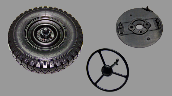Assemblage de la roue avant, pneu sur la jante, falque de frein avant et du volant de direction.
