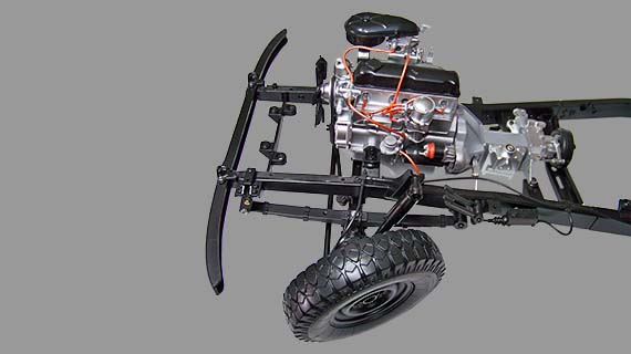 Assemblage de la suspension sur le châssis et montage de la roue surl’essieu avant gauche.